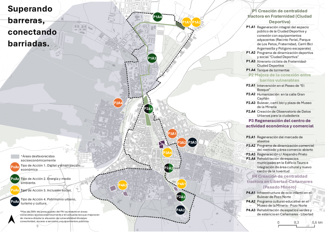 Algunas de las actuaciones previstas son la regeneración integral de la Ciudad Deportiva y la creación de un itinerario ciclista que conecta el norte y el sur del municipio; la rehabilitación y revitalización del Paseo de El Bosque y la pacificación de la calle Gran Capitán; la renovación del mercado de abastos y la rehabilitación del edificio Tauro como nuevo centro cultural y juvenil; y la puesta en valor del Museo de la Minería junto a la creación de nuevos espacios verdes y de ocio en Cañamares y Libertad.