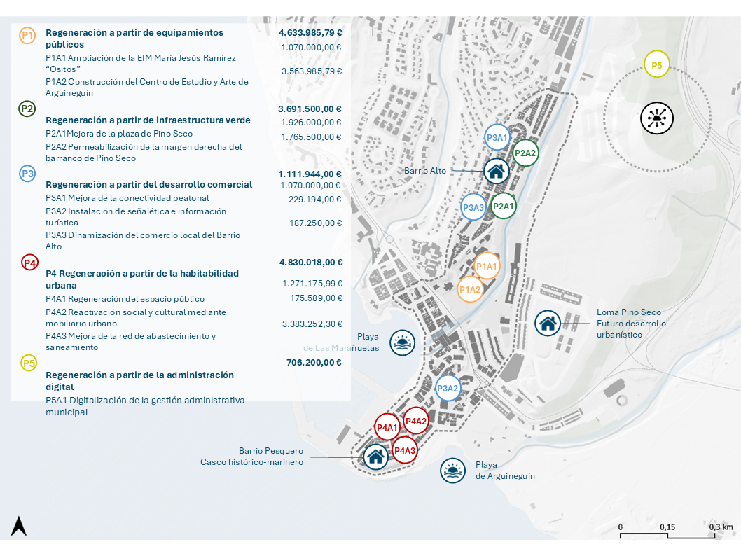 Esta estrategia se desarrolla a través de cinco proyectos locales de regeneración. La regeneración a partir de equipamientos públicos busca la transformación urbana y social a través la creación de un complejo cívico-cultural y educativo, ampliando la escuela infantil Ositos y el Centro de Estudios y Arte de Arguineguín. La regeneración a partir de infraestructura verde trabaja en la renaturalización del barranco de Pino Seco, consolidando la infraestructura verde para mejorar la sostenibilidad y la resiliencia ambiental del municipio. La regeneración a partir del desarrollo comercial plantea una estrategia de dinamización y diversificación del comercio en el Barrio Alto, aumentando su visibilidad y atractivo para residentes y visitantes. La regeneración a partir de la habitabilidad urbana se centra en la rehabilitación y renovación del viario del Barrio Pesquero de Arguineguín, mejorando el confort urbano y reforzando su identidad cultural y social. Por último, la regeneración a partir de la administración digital moderniza la gestión administrativa en Arguineguín mediante la digitalización de trámites y la mejora de la comunicación con el Ayuntamiento.