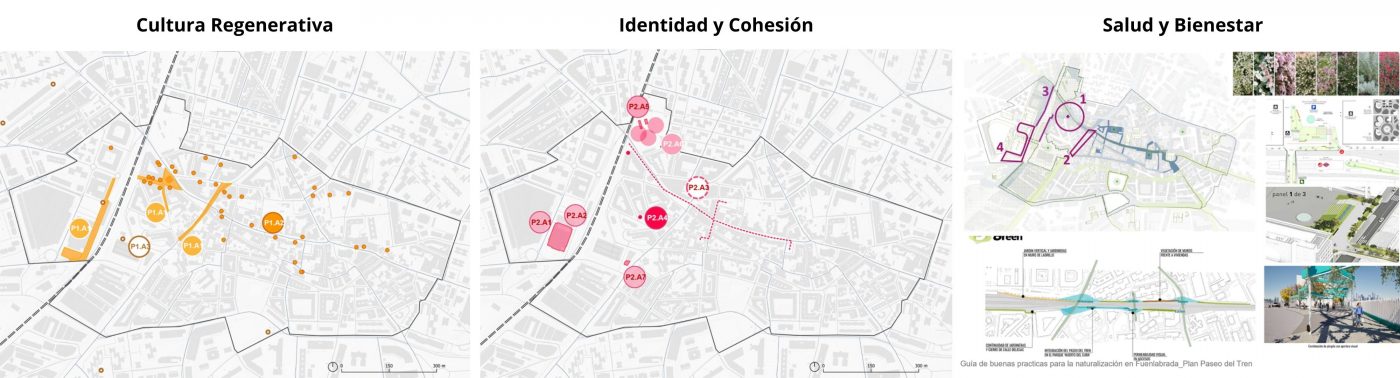 Junto al Ayuntamiento de Fuenlabrada, diseñamos un PAI que se propone eliminar los desequilibrios existentes en el Distrito Centro y avanzar hacia un modelo de desarrollo urbano sostenible, integrador y resiliente. Sus objetivos específicos son lograr un Centro + saludable mediante la regeneración urbana y la mejora de la conectividad; un Centro + habitable, a través del fortalecimiento sociocultural y la construcción de la identidad local; y un Centro + activo, impulsando la regeneración económica y la revitalización comercial. El PAI, alineado con los ejes estratégicos de la Agenda Urbana Fuenlabrada 2030 —Cultura Regenerativa, Identidad y Cohesión, y Salud y Bienestar—, propone actuaciones como la renaturalización del Distrito Centro, la reurbanización de la calle Luis Sauquillo y del entorno del barrio de la Estación y la revitalización del Parque Huerto del Cura como gran espacio verde y cultural. También se incluye la rehabilitación del polideportivo Fernando Martín y la creación de un centro cívico en su planta baja, la ampliación del Museo de Arte Urbano (MAUF) con nuevos murales y la activación de comercios vacíos mediante el modelo Meanwhile Spaces. Además, se prevé la extensión del sistema de aparcamientos seguros para bicis, la creación de un coworking basado en el modelo MILMA y la instalación de un jardín terapéutico vinculado al Centro de Mayores Ferrer i Guardia.